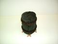 <木炭インテリア>直径の大きなくぬぎ材を焼き上げました。シュロ縄を巻いてかっこよく仕上げています。オリジナル木製置き台付、木炭は愛媛県上浮穴郡久万高原町産、友人が経営する炭焼工房の作品です。置き台は私の作品です。木炭最大直径17cm高さ21cm(画像木炭は現物商品です。同じサイズ、同じ形の物はありません。)